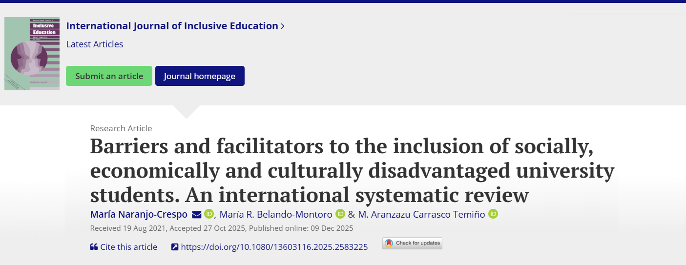 «Barriers and facilitators to the inclusion of socially, economically and culturally disadvantaged university students» el nuevo artículo de María Naranjo-Crespo en la revista International Journal of Inclusive Education